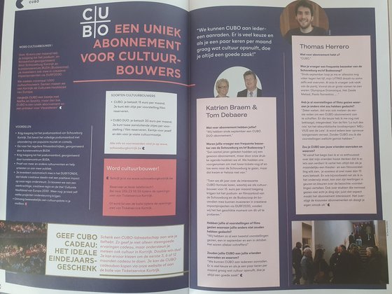 Lezers en bezoekers van het Schouwburgmagazine voorjaar 2022 hebben ons misschien opgemerkt als promotoren van het CUBO DUO-abonnement van de Schouwburg en Budascoop Kortrijk.